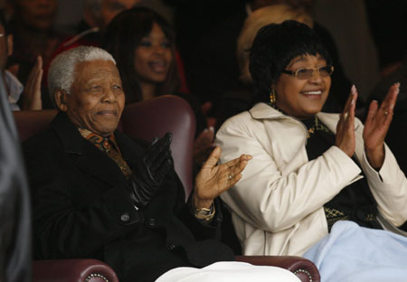Former South Africa President Nelson Mandela (L) and his ex wife Winnie applaud during the unveiling ceremony of a statue at the Groot Drakenstein prison in Paarl near Cape Town August 21, 2008. Mandela was finally released from the prison in February 1990, ending his 28 year incarceration. [Agencies]