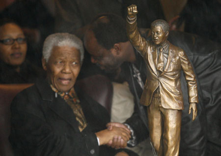 Updated: 2008-08-22 14:41 ![]() Former South Africa President Nelson Mandela speaks with an aide behind a statue that was unveiled at the Groot Drakenstein prison in Paarl near Cape Town August 21, 2008. Mandela was finally released from the prison in February 1990, ending his 28 year incarceration. [Agencies]