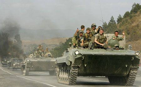 Russian military vehicles leave the Georgian town of Gori August 22, 2008. Russia said it was on course to complete a partial pullback of troops from Georgia by Friday night but the United States and Germany said they had not seen clear evidence of a substantial withdrawal. [Agencies]