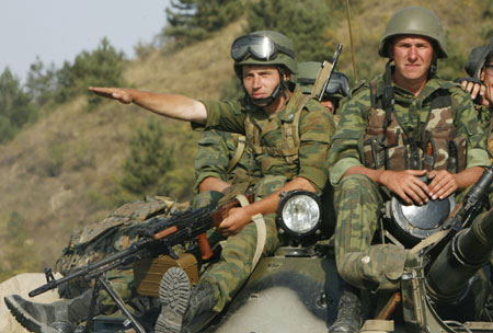 A Russian soldier gestures to the camera as Russian troops withdraw from Gori August 22, 2008. Russia said it was on course to complete a partial pullback of troops from Georgia by Friday night but the United States and Germany said they had not seen clear evidence of a substantial withdrawal. [Agencies]