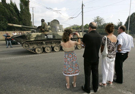 Georgians watch as a Russian military convoy leaves Georgia in the western Georgian city of Zugdidi August 22, 2008. A column of about 150 Russian military vehicles left Georgia proper on Friday and pulled back into the region of Abkhazia on the Black Sea, a Reuters cameraman said. [Agencies]