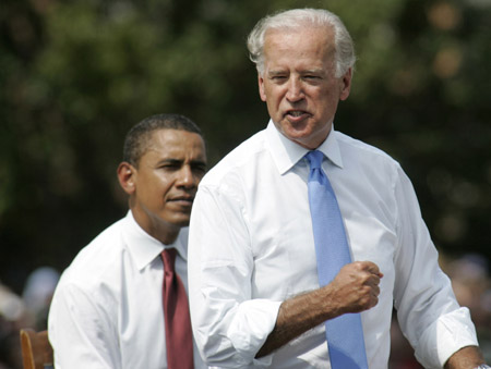 US Democratic presidential candidate Senator Barack Obama (L) listens while his vice presidential running mate Senator Joe Biden speaks at a campaign event at the Old State Capitol in Springfield, Illinois, August 23, 2008. [Agencies]