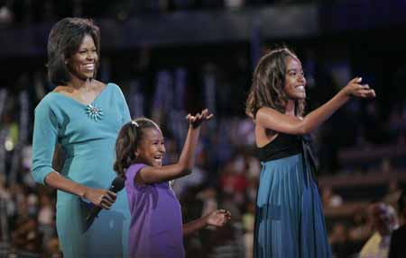 Michelle Obama talked about tucking in her daughters Malia and Sasha at night. "I think about how one day, they'll have families of their own. And one day, they — and your sons and daughters — will tell their own children about what we did together in this election. They'll tell them how this time, we listened to our hopes, instead of our fears. How this time, we decided to stop doubting and to start dreaming," she said. Michelle Obama's mission was to humanize her husband and convince skeptical voters to look past his unusual name and exotic background to envision him as the next president. Barack Obama has repeatedly faced questions about whether he's a real American. She also used the address to dismiss questions about her patriotism. Republicans have criticized her comments earlier this year that she was "really proud" of her country. Her answer at the convention was to express her love of country. The Obamas' two daughters joined their mother on stage after the speech as Stevie Wonder's "Isn't She Lovely" blared from in the convention hall. They spoke to Barack Obama, who appeared by satellite connection from Missouri. "How about Michelle Obama?" he asked the crowd. "Now you know why I asked her out so many times even though she said no. You want a persistent president." The girls responded to their father on the giant screen with "Hi, Daddy!" and "I love you, Daddy." Michelle Obama didn't explicitly address race, but allaying concerns among white voters was part of the strategy for the first black nominee of a major party. "Barack doesn't care where you're from, or what your background is, or what party — if any — you belong to. That's not how he sees the world," she said. "He knows that thread that connects us — our belief in America's promise, our commitment to our children's future — is strong enough to hold us together as one nation even when we disagree." She joked about his love of basketball and his overcautious driving when he drove their first daughter home from the hospital. She described his upbringing by a single mother and grandparents who "scrimped and saved so that he could have opportunities they never had themselves." E-mails and videos circulating on the Internet criticized him for attending a church that promoted black culture, for not wearing a flag pin on his lapel, for not putting his hand over his heart during the national anthem. They suggested — falsely — that he was secretly Muslim. Michelle Obama's job was to show voters they have nothing to fear. She said little about his policies beyond quickly mentioning his goal of ending the Iraq war, improving the economy and providing health for those who need it. Michelle Obama drew enthusiastic cheers by praising Hillary Rodham Clinton for putting "those 18 million cracks in the glass ceiling" — a reference to the failed Democratic candidate's vote total in the primaries. The crowd also roared. She was introduced by her brother, Craig Robinson, the head basketball coach at Oregon State University. Robinson noted that she memorized every episode of "The Brady Bunch" and praised her passion for helping others. And before she appeared, the audience watched "South Side Girl," a biographical film narrated by her mother. It covered everything from her childhood to her career in law to her puzzled reaction to a hotshot law student interning at her firm. |