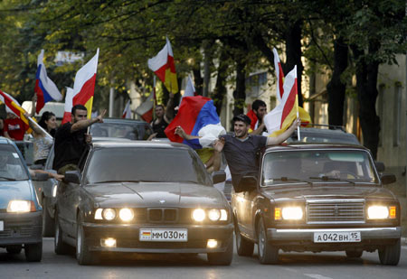 Updated: 2008-08-27 12:14 Local residents celebrate Russia's recognition of South Ossetia as an independent state wave Russian and South Ossetian flags in Tskhinvali August 26, 2008. Russia Tuesday formally recognized the South Ossetia and Abkhazia as two independent states, which is set to challenge the United States and its NATO allies who have been the staunch supporter of Georgia. [Agencies] |