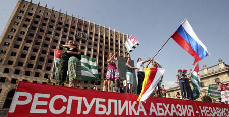 Updated: 2008-08-27 12:14 People wave Abkhazian (L), Russian (R) and South Ossetian (C) flags as they celebrate Russia's recognition of Abkhazia as an independent state in Sukhumi, August 26, 2008. Russian President Dmitry Medvedev announced on Tuesday that Moscow had decided to recognise the South Ossetia and Abkhazia as two independent states, setting it on a collision course with the West. The sign reads 'Republic of Abkhazia - Independent.' [Agencies] |