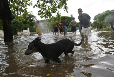 A dog and its owner walk through a flooded street in Havana August 26, 2008. Torrential rains hit the city as weather forecasters predicted on Tuesday that Hurricane Gustav would skirt the western coast of Cuba and enter the Gulf of Mexico as a powerful Category 3 hurricane with winds in excess of 100 mph by Sunday. [Agencies]