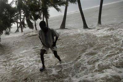 A man runs through high water during Hurricane Dean in Cayes-Jacmel in southeastern Haiti in 2007. A strengthening Hurricane Gustav is expected to make landfall in Haiti, where a tropical storm battered the impoverished Caribbean nation less than two weeks ago. [Agencies]