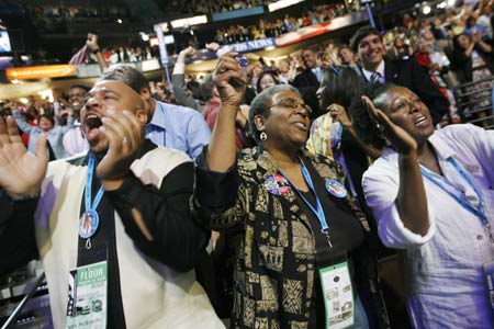 Updated: 2008-08-28 11:53 Democratic delegates dance, celebrate and sing after Senator Barack Obama (D-IL) is officially cast as the party's presidential nominee by acclamation at the 2008 Democratic National Convention in Denver, Colorado August 27, 2008. Obama is expected to accept the Democratic presidential nomination at the convention on August 28. [Agencies] |