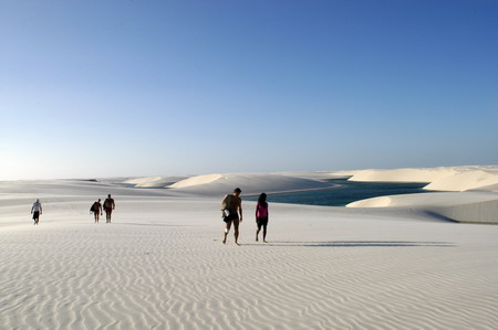 Visitors walk on the desert near San Luiz, city of northeast Brazil, Aug. 23, 2008. The desert, dotted with sizes of lakes formed by rainwater, attracts some 30,000 tourists annually. [Xinhua]