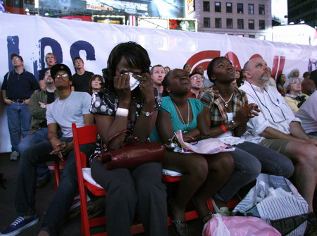A woman wipes away tears as she watches a live broadcast of US Democratic presidential candidate Senator Barack Obama (D-IL) on a screen in New York's Times Square August 28, 2008. Obama was addressing supporters in Denver during the Democratic National Convention. [Agencies]Obama sketches promise of America