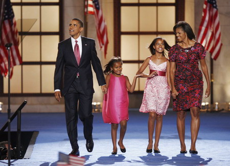 Democratic presidential nominee US Senator Barack Obama (D-IL) walks with his (L-R) daughter Sasha, daughter Malia, and wife Michelle after his speech at the 2008 Democratic National Convention in Denver, Colorado August 28, 2008. [Agencies]Obama sketches promise of America