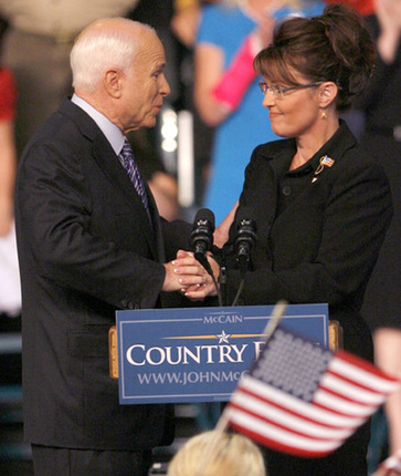 US Republican presidential candidate Senator John McCain holds the hand of his vice presidential running mate, Alaska Governor Sarah Palin (R) at a campaign event in Dayton, Ohio August 29, 2008. [Agencies]