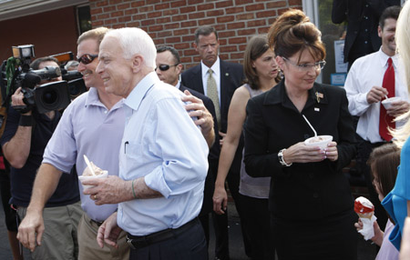 US Republican presidential candidate Senator John McCain and his running mate Alaska Governor Sarah Palin campaigns at an ice cream stand in New Concord, Ohio August 29, 2008.