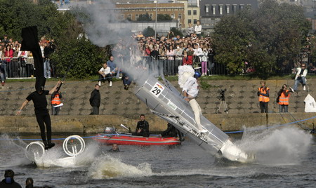Competitors jump into the Daugava River in an attempt to fly their homemade crafts during the Red Bull Flugtag competition in Riga August 31, 2008. [Agencies]