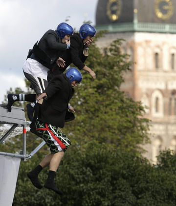Competitors jump into the Daugava River after an attempt to fly their homemade craft during the Red Bull Flugtag competition in Riga August 31, 2008. [Agencies]