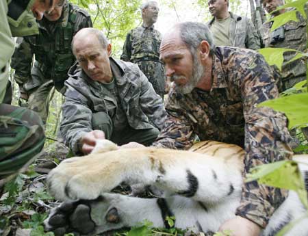 Russia's Prime Minister Vladimir Putin (L) holds a five-year-old tiger's head as scientists put on a collar with a satellite tracker on the animal in the academy of sciencies Ussuri reserve in Russia's Far East August 31, 2008. [Agencies]