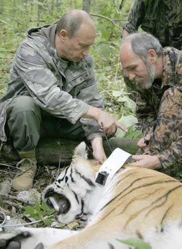 Russia's Prime Minister Vladimir Putin (L) holds a five-year-old tiger's head as scientists put on a collar with a satellite tracker on the animal in the academy of sciencies Ussuri reserve in Russia's Far East August 31, 2008. [Agencies]