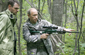 Russia's Prime Minister Vladimir Putin holds a tranquilliser gun as he visits the academy of sciences Ussuri reserve in Russia's far east August 31, 2008. [Agencies]