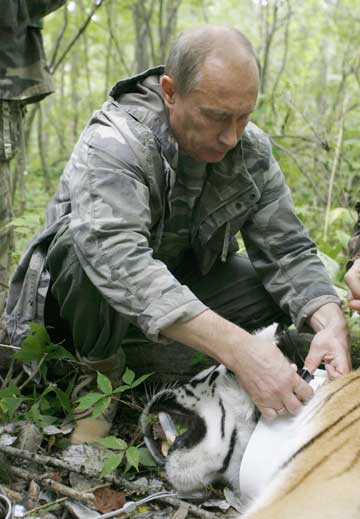 Russia's Prime Minister Vladimir Putin holds a five-year-old tiger's head as he looks at a collar with a satellite tracker on the animal in the academy of sciencies Ussuri reserve in Russia's Far East August 31, 2008. [Agencies]