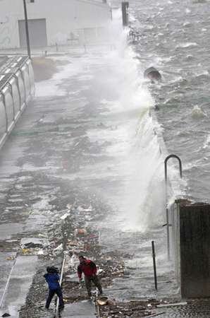 A television crew makes a report from the flood wall along the Industrial Canal in the Ninth Ward in New Orleans, Louisiana September 1, 2008. The center of Hurricane Gustav came ashore as a Category 2 hurricane near Cocodrie, Louisiana, the U.S. National Hurricane Center said on Monday. [Agencies] |