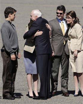 Republican presidential candidate John McCain hugs Bristol Palin, daughter of Republican vice presidential candidate Sarah Palin, and her husband, Todd, right, on his arrival in Minneapolis for the Republican National Convention in St. Paul, Minn., Wednesday, Sept. 3, 2008. At left is Bristol's boyfriend, Levi Johnston. [Agencies]