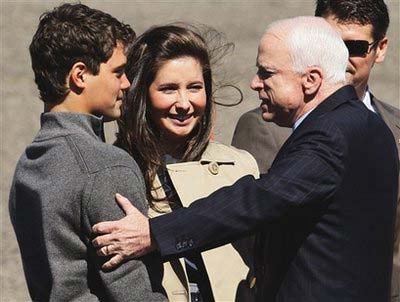 Republican presidential candidate Sen. John McCain, R-Ariz., right, greets Levi Johnston, left, boyfriend of Bristol Palin, center, the pregnant daughter of vice presidential candidate Alaska Gov. Sarah Palin, not pictured, as McCain arrives in Minneapolis, where he will attend the Republican National Convention Wednesday, Sept. 3, 2008. [Agencies]