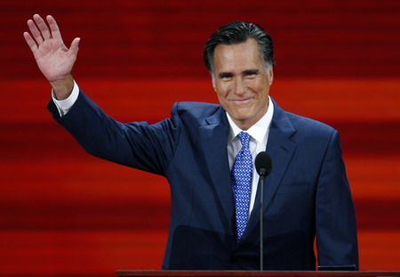 Former Republican presidential candidate Mitt Romney waves as he takes the stage at the 2008 Republican National Convention in St. Paul, Minnesota, September 3, 2008. [Agencies]