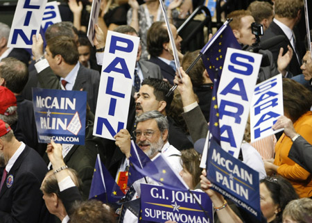 Conventioneers hold up signs in support of vice presidential candidate Alaska Gov. Sarah Palin at the 2008 Republican National Convention in St. Paul, Minnesota September 3, 2008. [Agencies]
