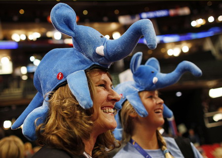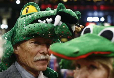 Florida delegates wear alligator hats, one of which contains a miniature replica of Democratic presidential nominee Barack Obama (L) protruding from its mouth, for the start of the third session of the 2008 Republican National Convention in St. Paul, Minnesota September 3, 2008. [Agencies]