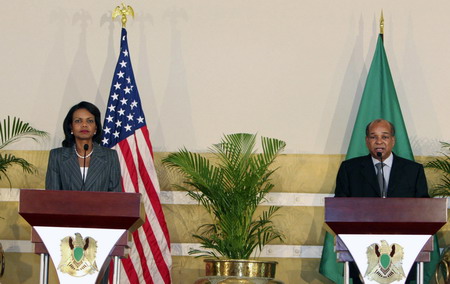US Secretary of State Condoleezza Rice(L) listens to Libyan Foreign Minister Abd al-Rahman Shalgham during a news conference in Tripoli September 5, 2008. Rice met Libyan leader Muammar Gaddafi -- once reviled as a "mad dog" by a US president -- on Friday on a historic visit which she said proved that Washington had no permanent enemies. [Agencies]