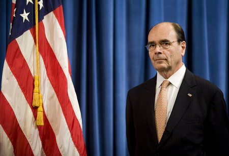 Jim Lockhart, Director of the the new independent regulator, the Federal Finanace Agency (FHFA), stand during a news conference with US Secretary of the Treasury Henry Paulson, announcing that the government is taking control of mortgage finance companies Fannie Mae and Freddie Mac, at the Office of Management Supervision in Washington, DC, September 7, 2008. [Agencies]
