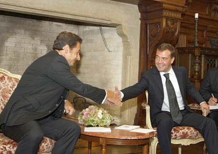 "Russia has received from the countries of the European Union, and France which is chairman of the European Union, a guarantee of the non-use of force by Georgia," said Medvedev after meeting French President Nicolas Sarkozy. Medvedev said there was an agreement in principle to deploy a 200-strong EU monitoring contingent after he met Sarkozy and an EU delegation at his official residence outside Moscow to discuss the fallout of the Georgia conflict. |