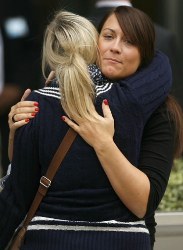 Workers embrace outside the office of the U.S. investment bank Lehman Brothers in the Canary Wharf district of London on September 15, 2008. Global markets plummeted on Monday after investment bank Lehman Brothers filed for bankruptcy protection, rival Merrill Lynch agreed to be taken over and the Federal Reserve threw a life line to the battered financial industry. [Agencies]