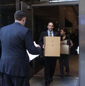 A man and woman walk out of the Lehman Brothers building carrying boxes in New York September 15, 2008. Stunned and angry, Lehman Brothers' employees packed their bags at company headquarters in New York, with some bitterness over the 158-year-old company's failure aimed at Chief Executive Richard Fuld. [Agencies]