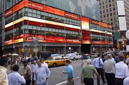 Pedestrians walk past the Lehman Brothers Holdings Inc building in New York September 15, 2008. Lehman Brothers Holdings Inc filed for bankruptcy after trying to finance too many risky assets with too little capital, becoming the largest and highest-profile casualty of the global credit crisis. Based on assets, Lehman far surpassed WorldCom as the largest US bankruptcy ever. Lehman had assets of $639 billion at the end of May, while WorldCom had $107 billion when it filed for bankruptcy protection in 2002. [Agencies]