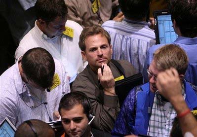 Traders work in the product options pit at the New York Mercantile Exchange in New York, Monday, September 15, 2008. Oil prices plunged to a seven-month low Monday as the Gulf Coast energy infrastructure appeared relatively unharmed after Hurricane Ike and traders bet that Lehman Brothers' bankruptcy could ignite a massive liquidation of commodities. [Agencies]