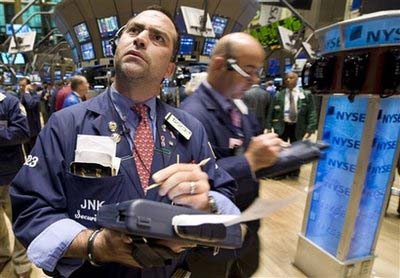 Trader Joseph Acquafredda, left, check the numbers near the close of trading on the floor of the New York Stock Exchange, Wednesday September 17, 2008. The Dow Jones industrial average dropped 449.36 or - 4.06 percent. [Agencies]
