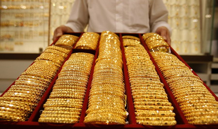 A shop attendant displays a tray of gold bangles for the camera at a jewellery story in Singapore September 18, 2008. Gold reversed earlier gains to fall below $860 per ounce on Thursday, down about 0.4 percent from the previous day, as buying ran out of steam. It had earlier risen by more than 3 percent to $892.10, extending its biggest ever one-day rise in absolute dollar terms on Wednesday, when buyers flocked to the precious metal as a safe haven asset, and as a hedge against falling stocks. [Agencies]