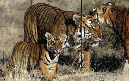 A six-month-old cub walks next to his parents at the Laohu Valley Reserve near Philippolis September 18, 2008. [Agencies]