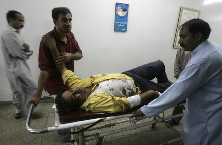 An injured man is shifted to a hospital after a bomb explosion at a hotel in Islamabad September 20, 2008. A suicide car bomber attacked the Marriott Hotel in the Pakistani capital, Islamabad, on Saturday, killing at least 53 people and turning the hotel into an inferno, police said. [Agencies]