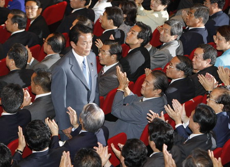 Former foreign minister Taro Aso bows to parliamentarians of the ruling Liberal Democratic Party (LDP) after he was chosen as the party president during the LDP parliamentarian meeting at the party headquarters in Tokyo September 22, 2008. Japan's main ruling party chose outspoken nationalist Taro Aso, an advocate of more government spending to boost the economy, to be next prime minister and woo voters ahead of an election expected as early as next month. [Agencies]