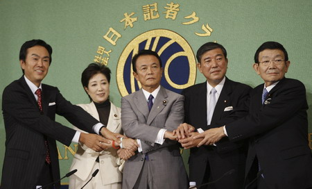 Japan's ruling Liberal Democratic Party presidential election candidates (L-R) former administrative reform minister Nobuteru Ishihara, former defence minister Yuriko Koike, former foreign minister Taro Aso, former defence minister Shigeru Ishiba, and Economics Minister Kaoru Yosano shake hands at start of their debate session for the party's presidential election to become the next Japanese prime minister, at the Japan National Press Club in Tokyo September 12, 2008. [Agencies]