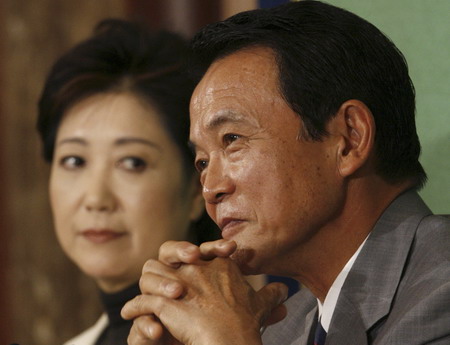 Japan's ruling Liberal Democratic Party presidential election candidates former foreign minister Taro Aso (R) listens to questions as former defence minister Yuriko Koike looks on during their debate session for the party's presidential election to become the next Japanese prime minister, at the Japan National Press Club in Tokyo September 12, 2008. [Agencies]