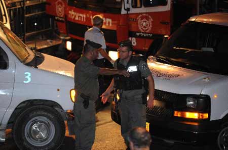 Updated: 2008-09-23 14:08 Israeli police officers stand at the scene of an attack in Jerusalem September 22, 2008. A man driving a black BMW plowed into a crowd of people at a busy Jerusalem intersection Monday evening, leaving 19 people hurt, an Israel Police spokesman said. [Xinhua] |