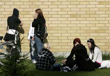 Students talk at the gathering point near the Kauhajoki vocational high school September 23, 2008. A student shot dead 10 people before shooting himself fatally at a vocational school on Tuesday, Finland's second such attack in less than a year and just one day after the gunman was interviewed by police over Internet postings. [Agencies]