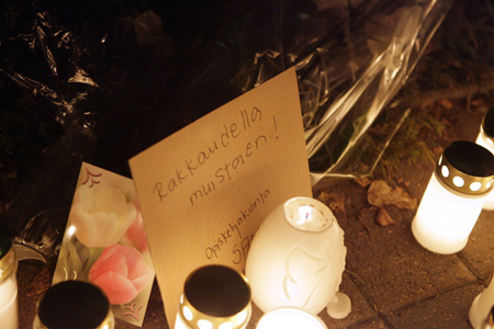 Candles and memorial cards lie in front of a vocational school in Kauhajoki about 350 km (217 miles) from Helsinki September 24, 2008. A student shot dead 10 people before shooting himself fatally at a vocational school on Tuesday, Finland's second such attack in less than a year and just one day after the gunman was interviewed by police over Internet postings. [Agencies]