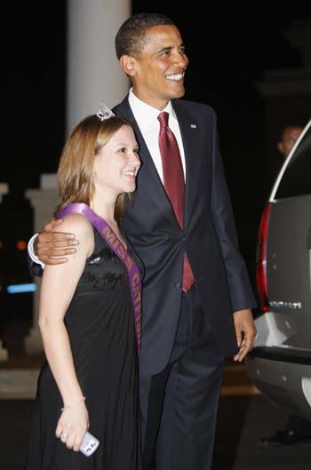 US Democratic presidential nominee Sen. Barack Obama walks with Miss Catfish 2008 Leah Barger prior to the first US presidential debate in Oxford, Mississippi, September 26, 2008. [Agencies]