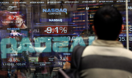 A man looks into the window at the NASDAQ Market Site in New York, September 29, 2008. The Dow industrials plunged on Monday in the blue-chip average's biggest one-day point drop ever after US lawmakers unexpectedly rejected a $700 billion financial bailout, spooking investors who saw it as essential to halting a global market meltdown. [Agencies]