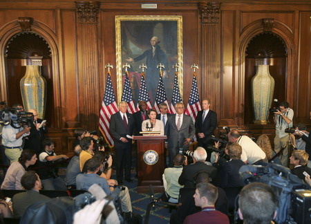 US Speaker of the House Speaker Nancy Pelosi (D-CA) speaks to a news conference flanked by (L-R) House Majority Leader Rep. Steny Hoyer (D-MD), House Majority Whip James Clyburn (D-SC), Democratic Caucus Chairman Rahm Emanuel (D-IL), House Financial Services Committee Chairman Barney Frank (D-MA) and Rep. Chris Van Hollen (D-MD) after the compromise financial bailout bill failed to pass during a vote of the House of Representatives on Capitol Hill in Washington, September 29, 2008. [Agencies]
