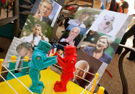 Boxing robots representing Democratic vice presidential nominee Senator Joe Biden and Republican vice presidential nominee Alaska Governor Sarah Palin compete outside the vice presidential debate between Biden and Palin in St. Louis, Missouri, October 2, 2008. [Agencies]